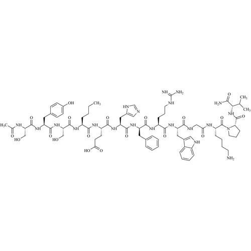 Afamelanotide is a fully characterized chemical compound used as a reference standard of API Afamelanotide. The standard offered is compliant with regulatory guidelines. Afamelanotide is used for analytical method development, method validation (AMV), and Quality Controlled (QC) applications during synthesis and formulation stages of drug development and serves as a reference standard for traceability against pharmacopeial standards (USP or EP). Axios Research products are intended for analytical purposes only and are not for human use. CAS - 75921-69-6